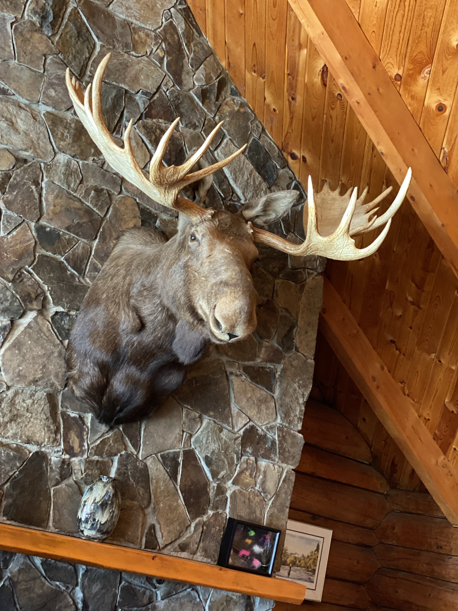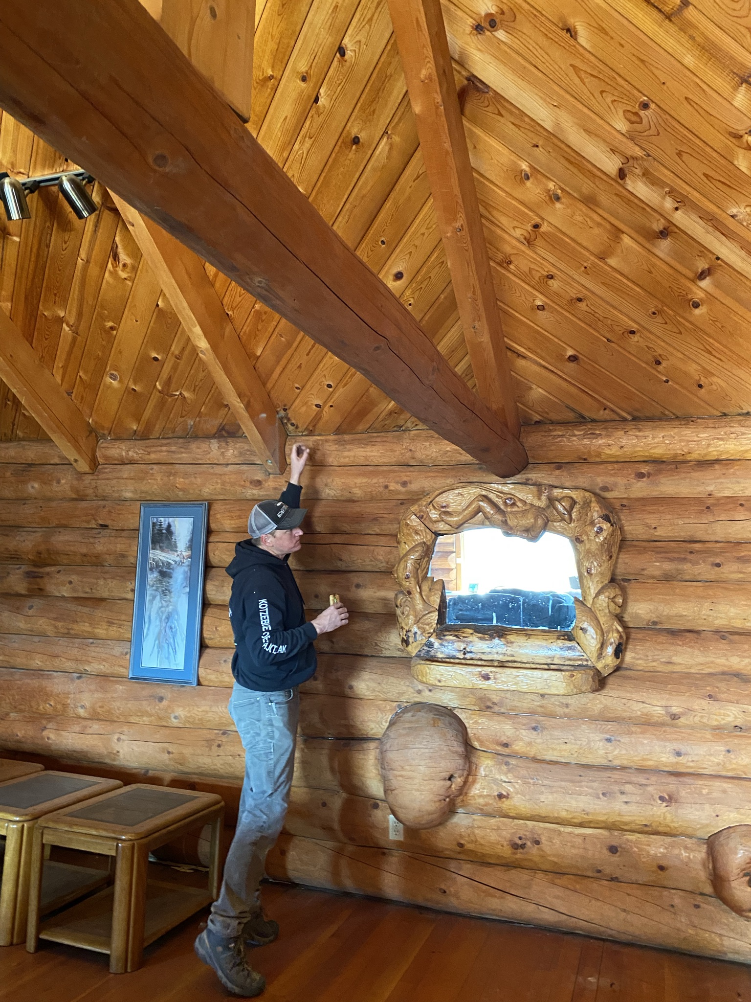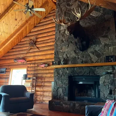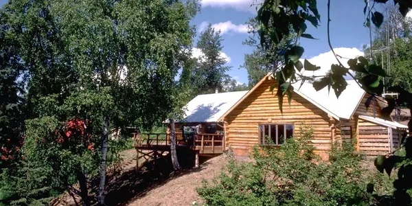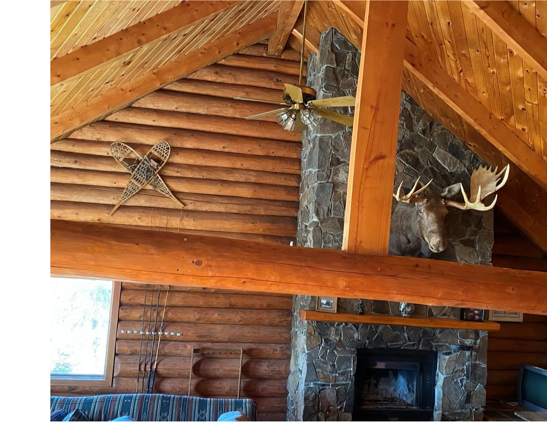 Tal-Adventures Lodge boasts masterful native log architecture featuring a grand stone fireplace and lavish furnishings. Its expansive picture windows and open deck provide breathtaking vistas of the snow-capped mountains.