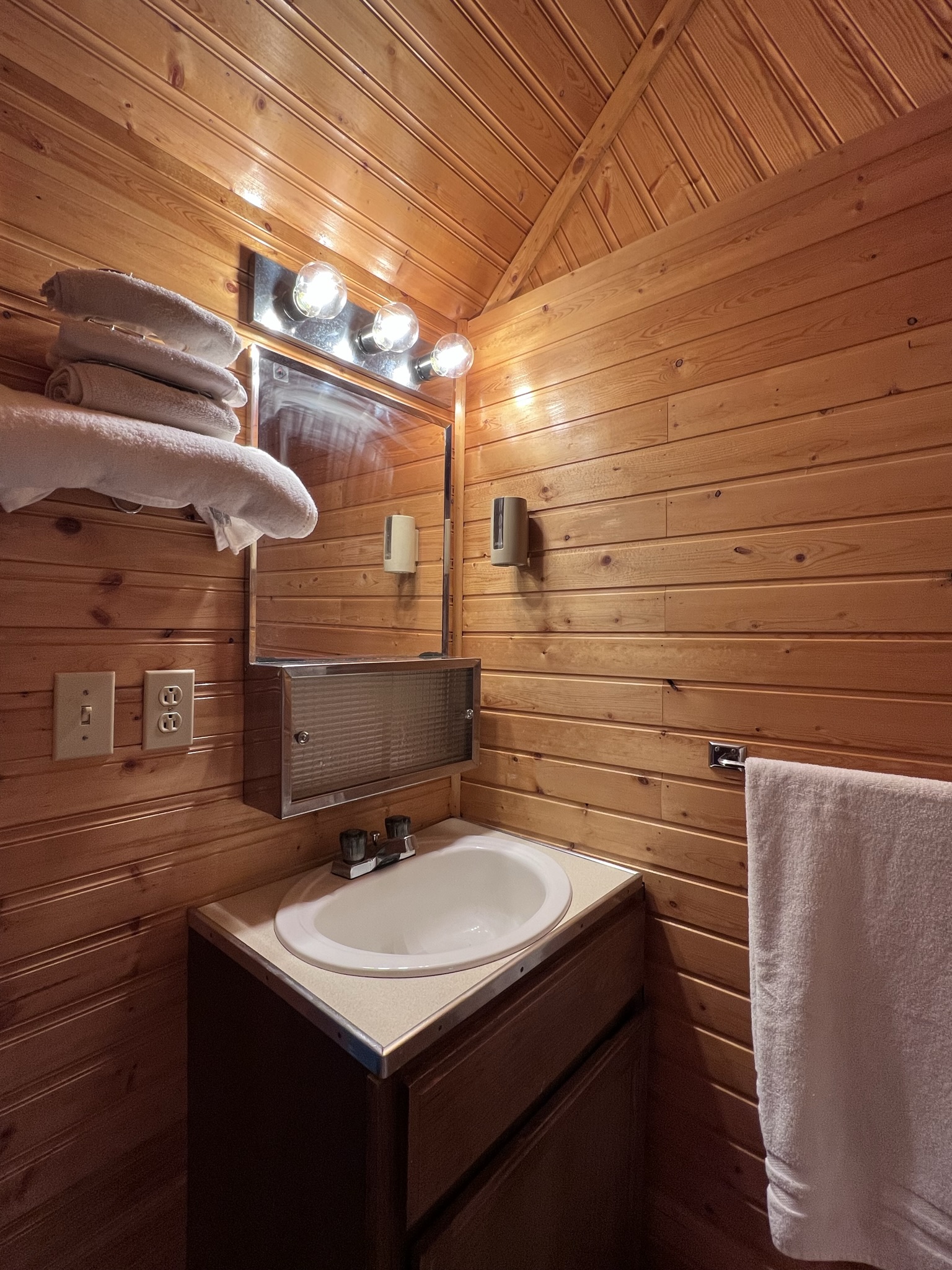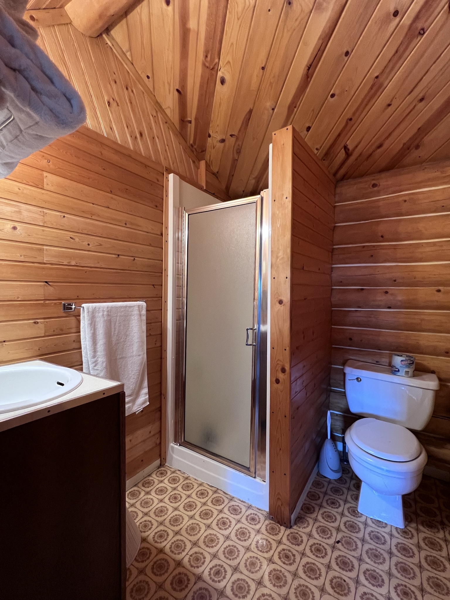Next to these cabins is the bathhouse. It has two spacious bathrooms. Each bathroom is furnished with a sink, shower, and a flushing toilet. These facilities boast hot and cold running water and electricity powered by the lodge’s own power plant.